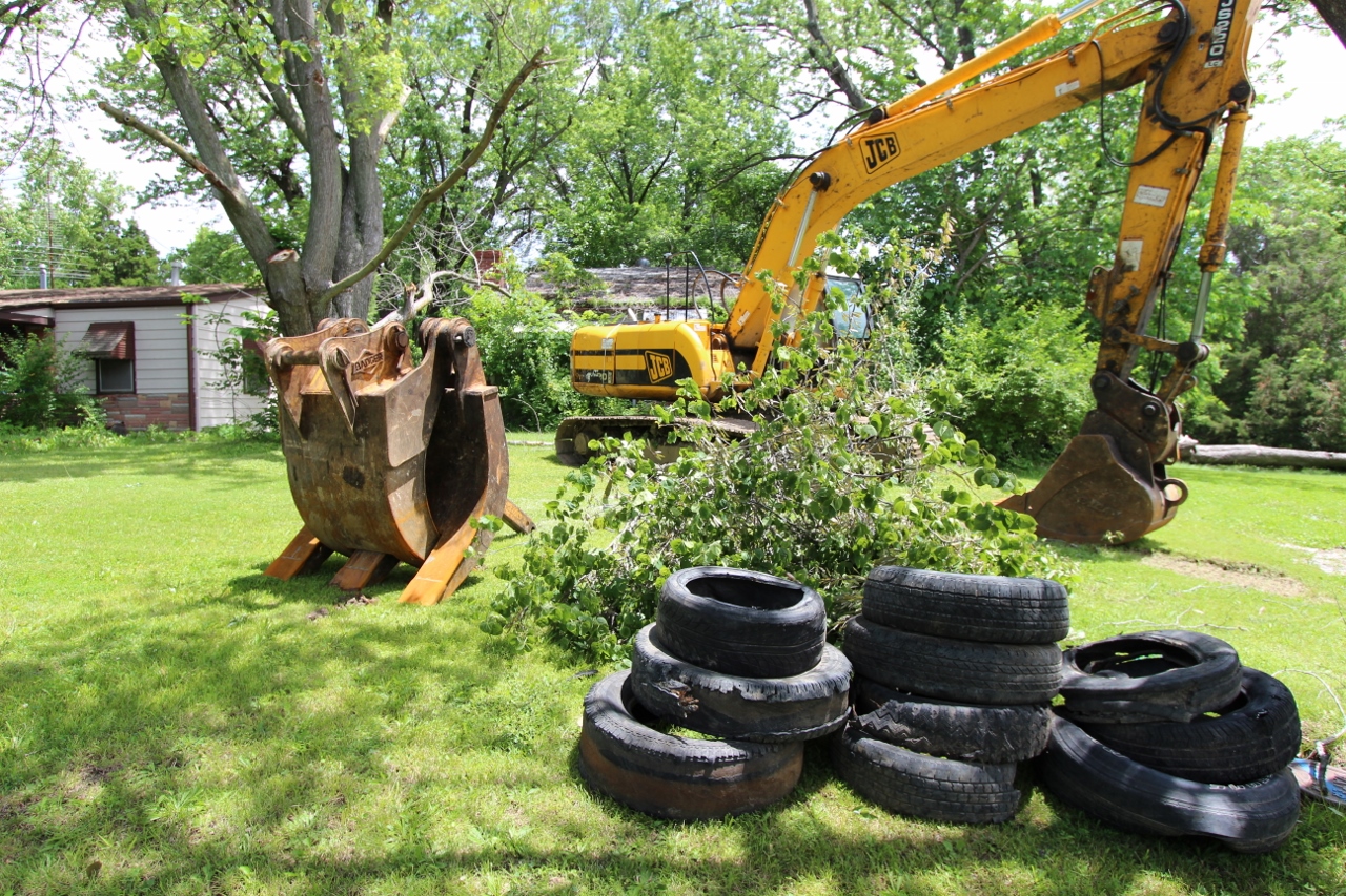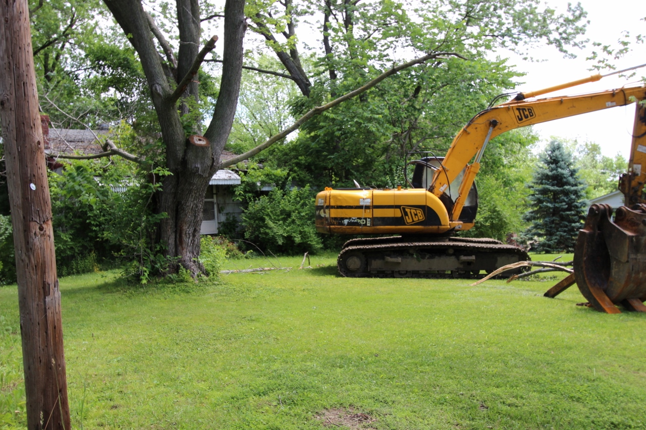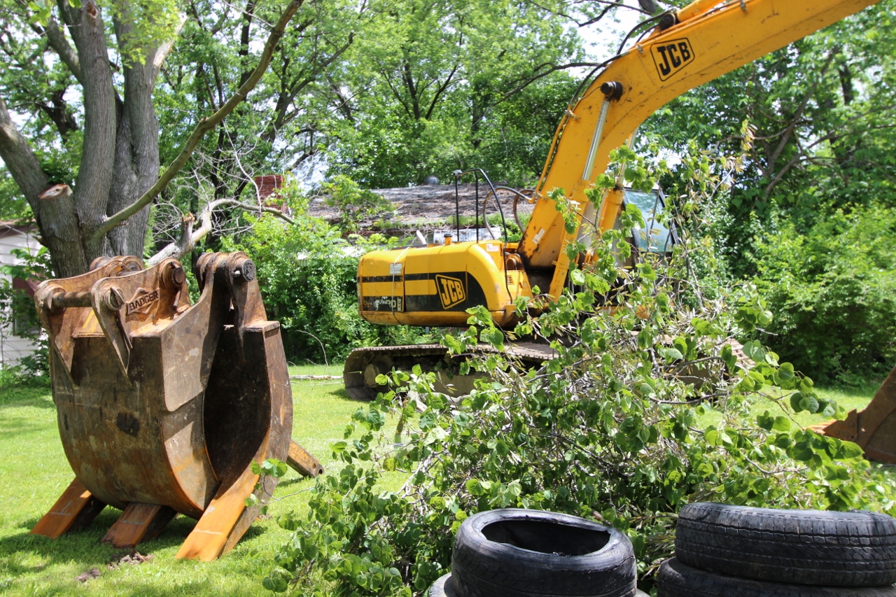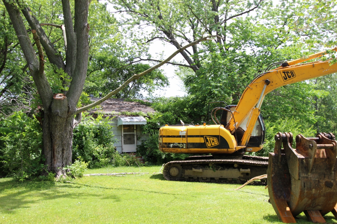 Back in April I wrote about “The House that Nobody Loves”, an abandoned house that sits overgrown with weeds and tree saplings growing out of the gutters. Bushes are growing up the side of the house and working their way under the shingles. The house has fallen in disrepair waiting lonely for someone to love it again. Well today as I drove past it, I noticed something new in the front yard. A giant backhoe was parked waiting patiently for someone to come and start it up. Next to the backhoe sits an equally large dump bucket, according to Mitch, but I think it looks like a giant pair of grabbers. Grabbers with huge fingers ready to rip through the failing roof and rip it apart.