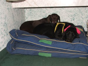 I came back contact solution in hand and finished getting ready for bed. That’s when I realized I should have bought pillows. The bed had two pillows on it, one small pillow and one smaller pillow. The bed had a definite tilt to it. The foot of the bed was higher than the head of the bed. Sitting on the bed felt like sitting on quarter inch plywood laid over springs, not comfortable at all. To top it off, Orso was disoriented and clingy, making himself at home across the foot of the bed, shortening the length of the bed by two feet. Mitch on one side, me on the other and here comes Charlie making himself comfortable between us. A full size bed is large enough for the two of us, but add in one hundred eighty pounds of dogs and the bed gets really small very quickly. Charlie wasn’t happy with the hardness of the bed and kept squirming around flopping on my stomach. We laid there for about thirty minutes listening to the refrigerator cycle on and off. I finally couldn’t take it anymore got up and unplugged it. Between Orso at the foot of the bed, Charlie squirming around in the bed and a bed that felt like sleeping on plywood neither one of us got more than a couple of hours sleep. If I hadn’t been afraid of what disgusting things had been ground into to the carpet I would have slept on the floor.