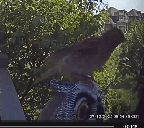 It continued to work for about three years, but the birds are starting to wise up and realize that the owls are not the big bad “wolf” anymore. We have started to notice bird dropping on the porch again and the birds are flying in a couple of large bushes in front of the house and hanging out. Yesterday I got a notification on my phone from the doorbell camera that there was a person on the porch. I could not believe what I saw when I answered my phone. A Sparrow flew to and landed on the owl’s head. It only flew off when the owl’s head turned around. What a slap in the face! I laughed so hard, the dog was startled.