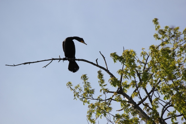For the last three years we have had Crested Cormorants stop here on their annual Spring migration North, maybe heading to Minnesota.  I was so surprised the first time I saw these water birds that look similar to ducks roost in trees.  They are black with a crest on top of their heads with an orangish red shade on their lower bills.  They swim very low in the water and have long necks.
